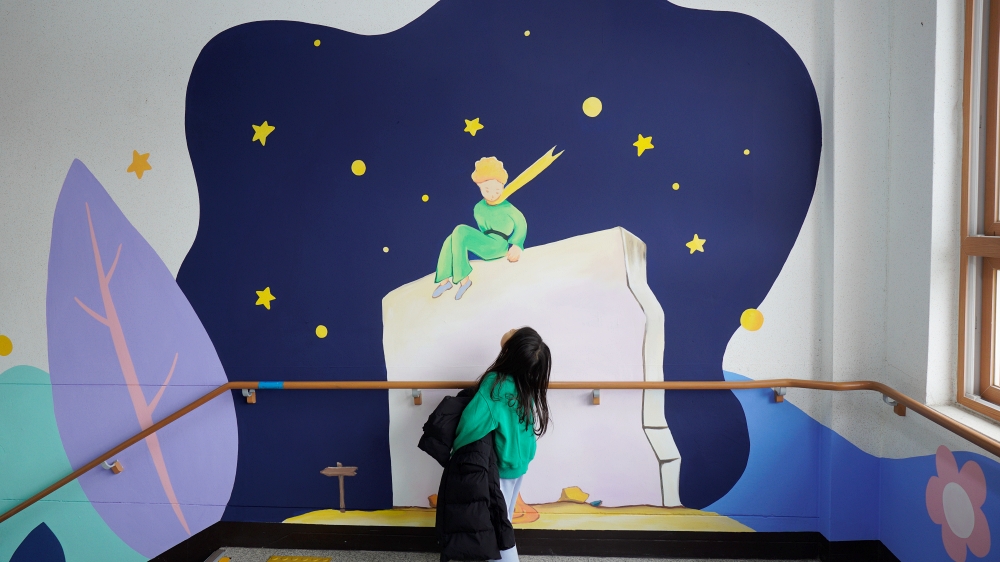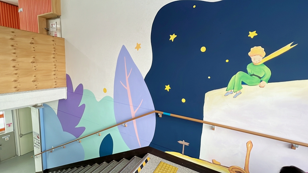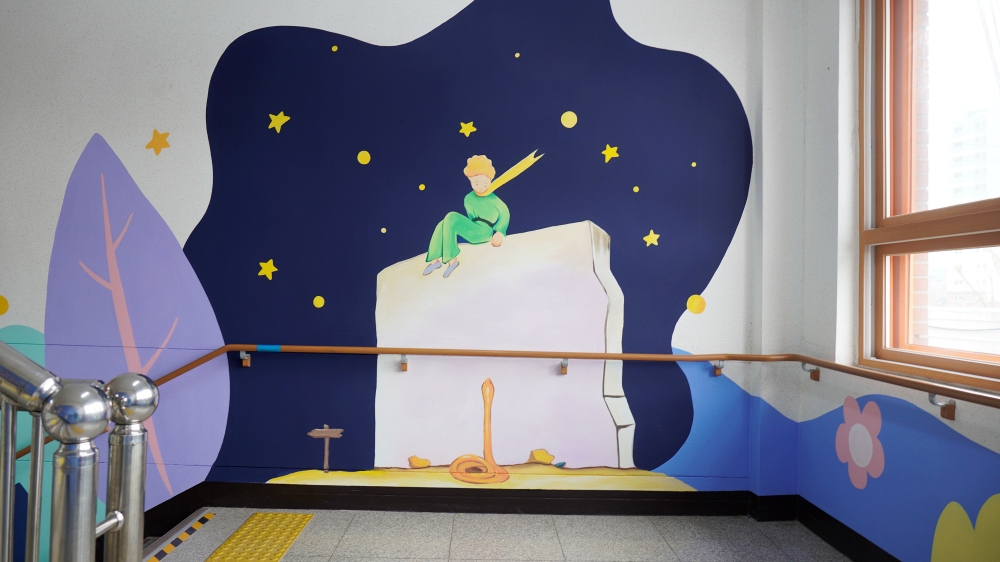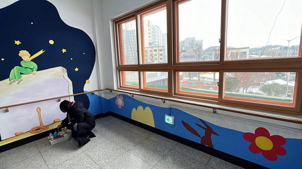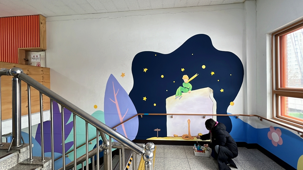 아이들을 위한 계단 복도벽면에 3가지 주제로 한 사랑스러운 벽화입니다.