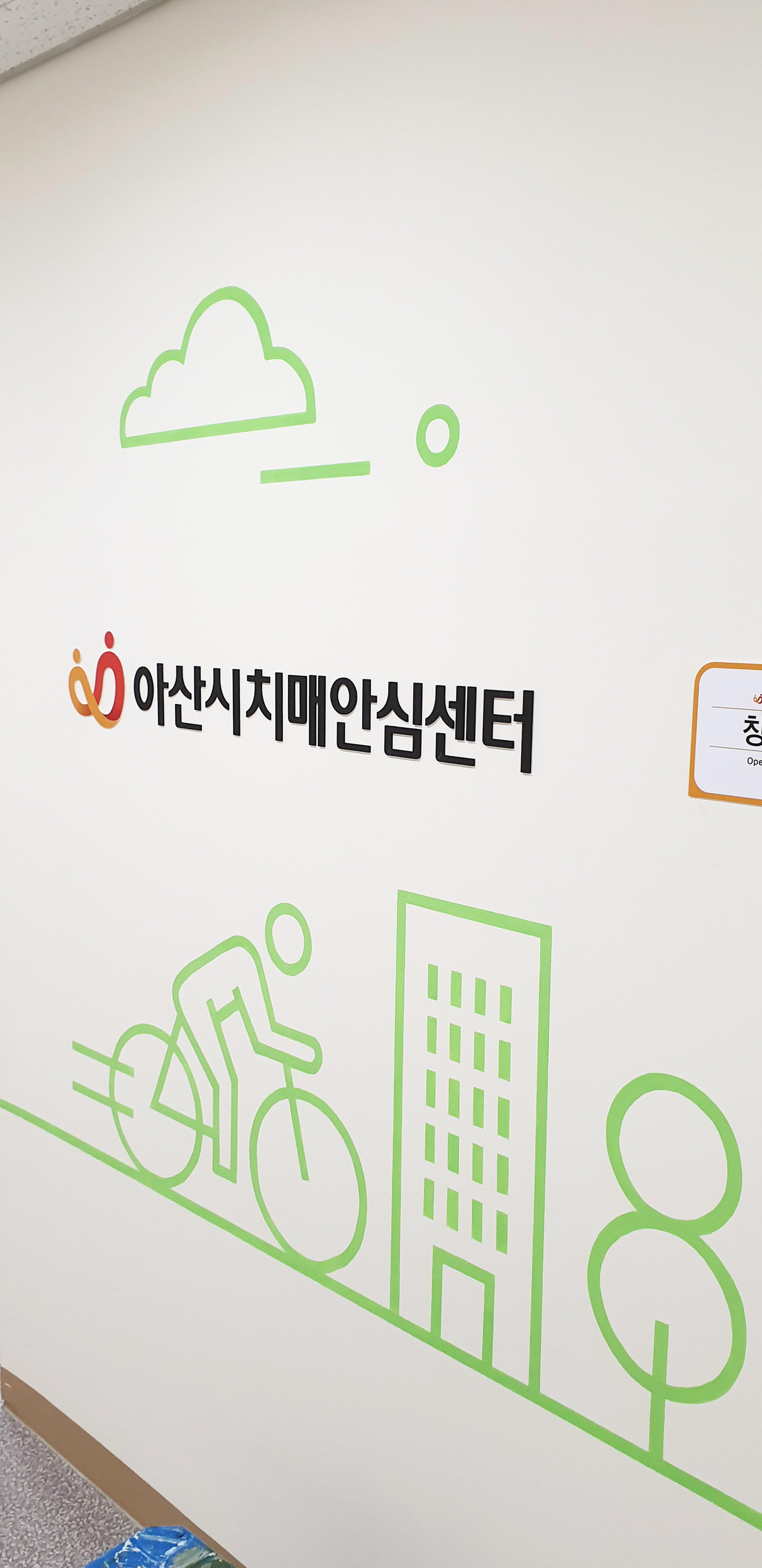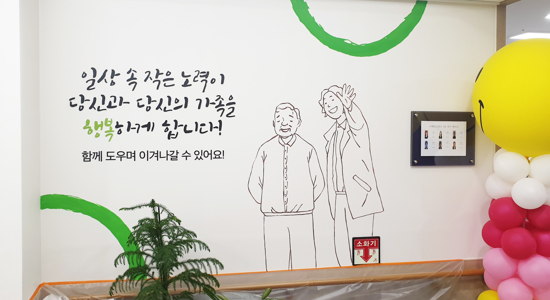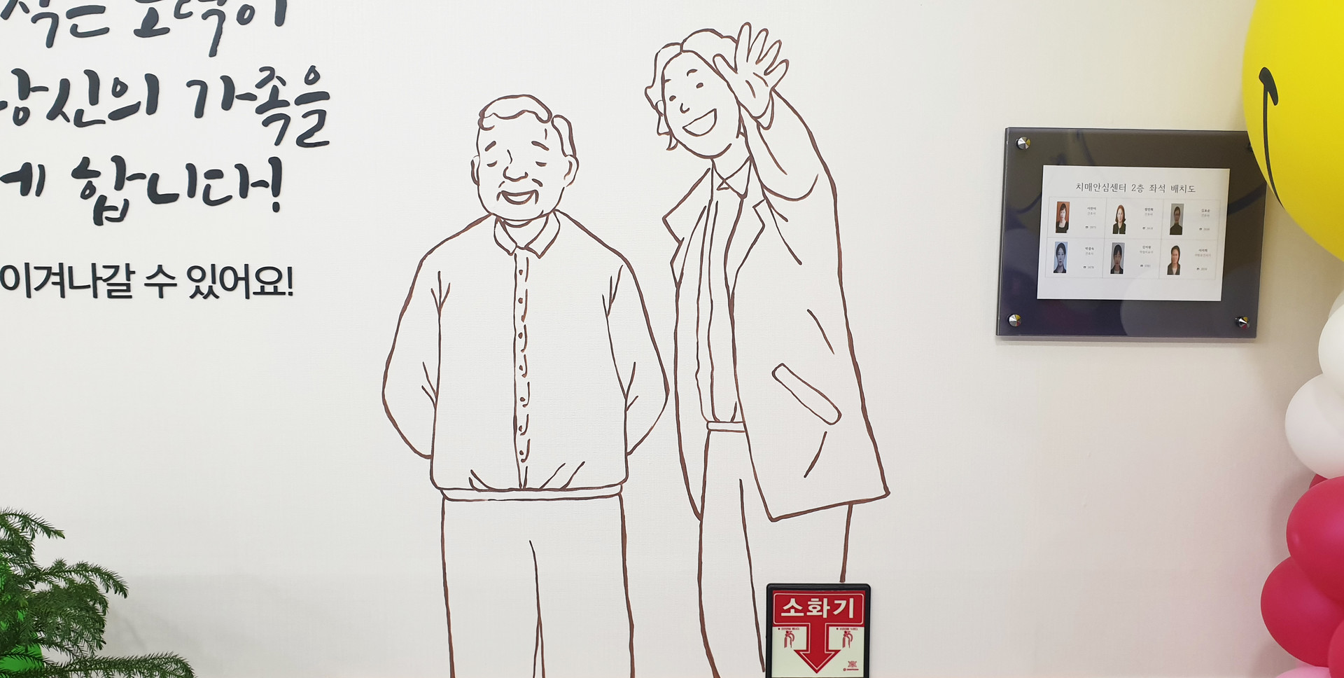 아산 치매안심센터 벽면에 메세지와 어울리는 그림을 라인드로잉으로