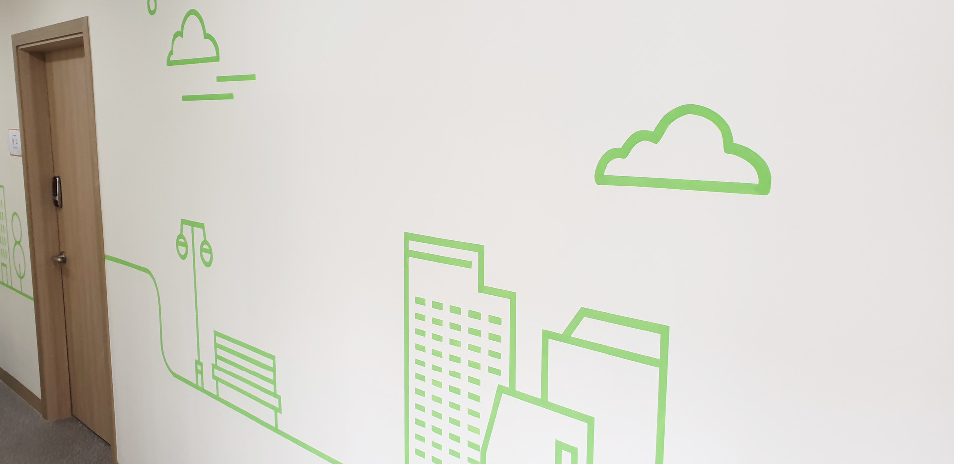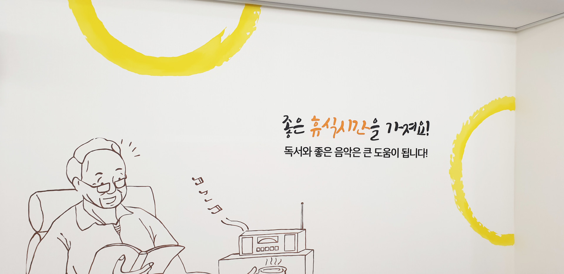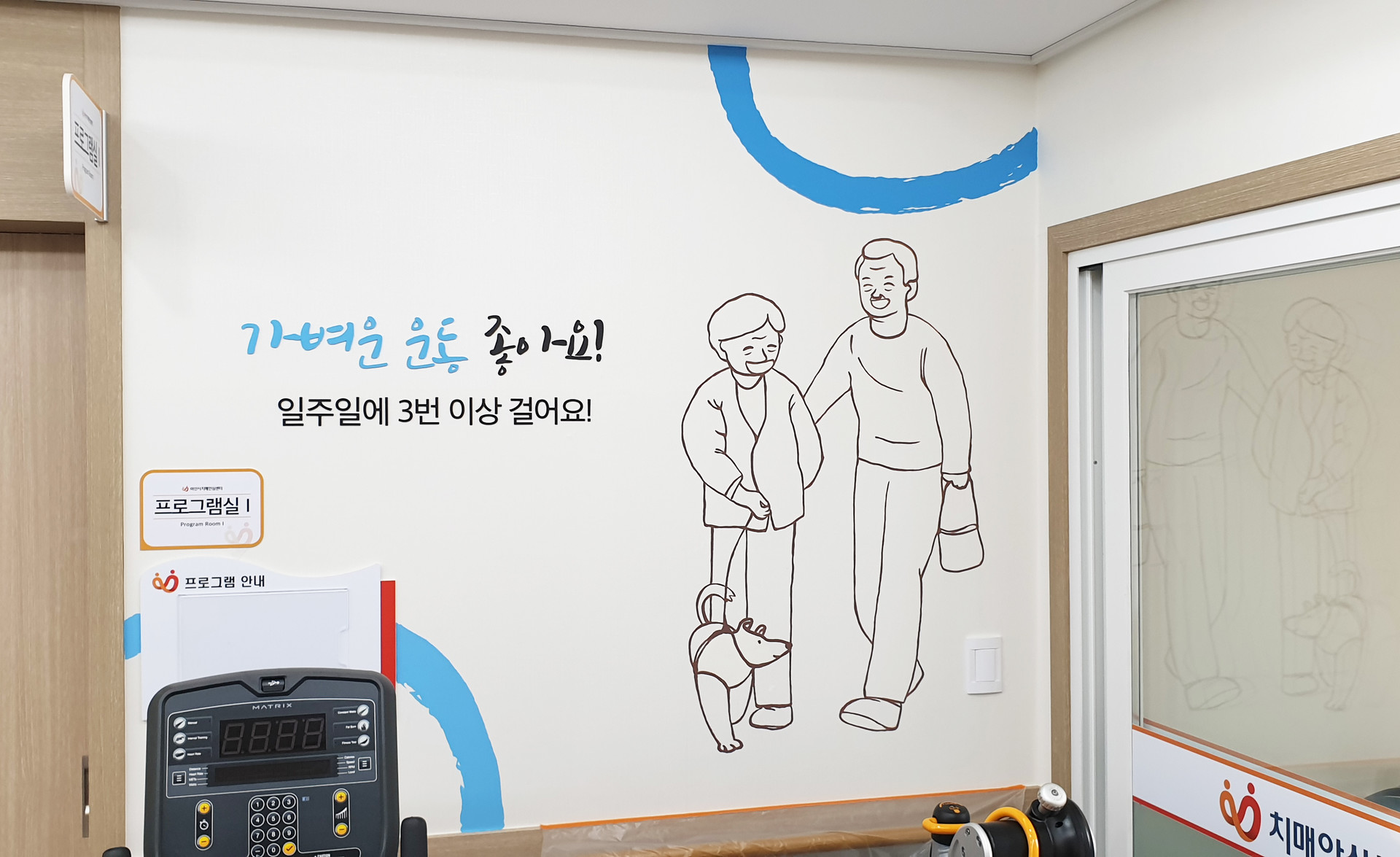 아산 치매안심센터 벽면에 메세지와 어울리는 그림을 라인드로잉으로