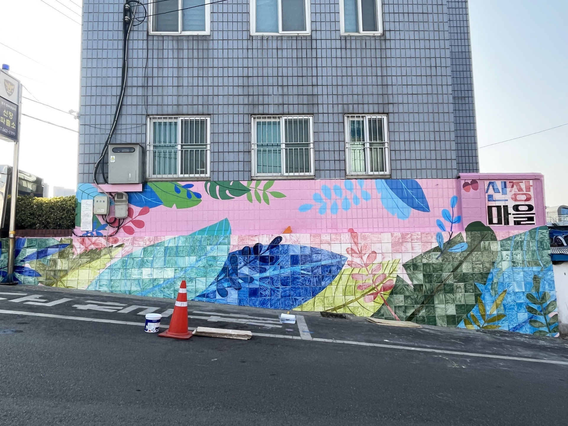 타일벽화와 어우러지도록 상부벽면 벽화제작하였습니다.