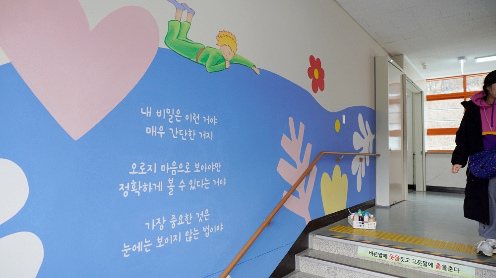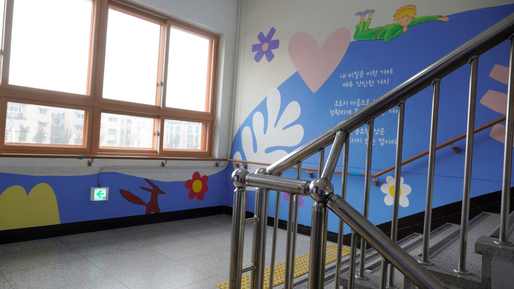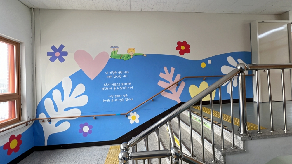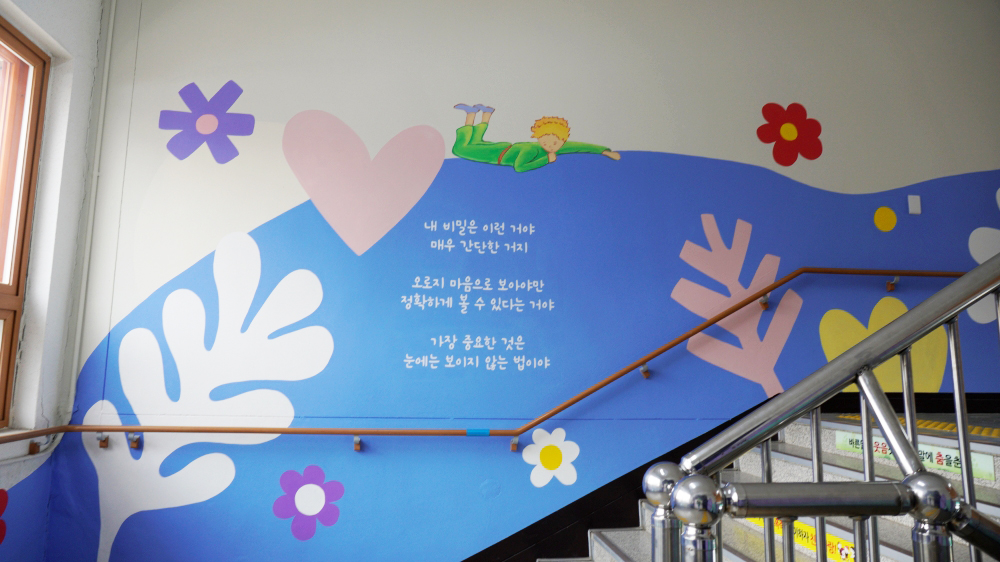 아이들을 위한 계단 복도벽면에 3가지 주제로 한 사랑스러운 벽화입니다.